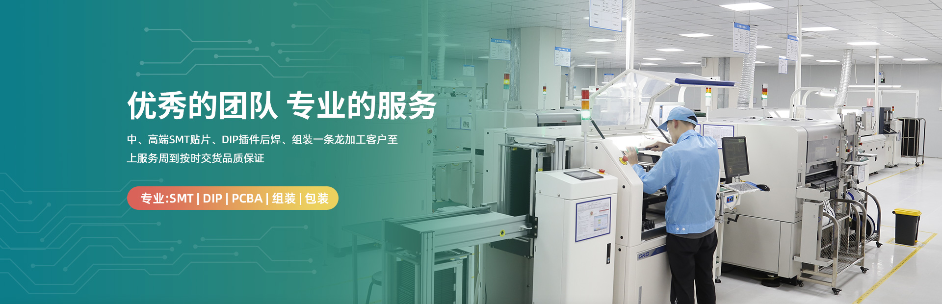 主要服务有:提供SMT贴片、DIP、ICT测试、FCT测试、镭雕、三防漆涂覆、整机组装、测试、老化包装等全流程的服务。
